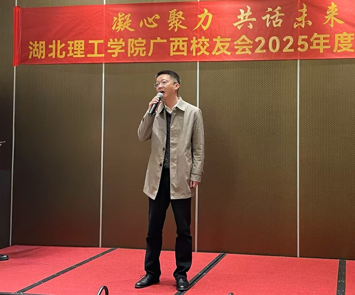 年会当天氛围热烈,篮球联赛、足球联赛等丰富多彩的互动活动穿插其间,师生们在赛场切磋交流,既重温了青葱校园时光,更传承了“艰苦创业、自强不息、敢为人先、开放创新”的理工精神。致辞环节中,干洪伟代表学校向广西校友们致以诚挚问候与美好祝愿,对广西分会的规范运作与工作成果表示肯定。他表示,母校的发展离不开广大校友的鼎力支持,期待校友们持续加强联络、深化合作,为学校事业发展注入更强动力。